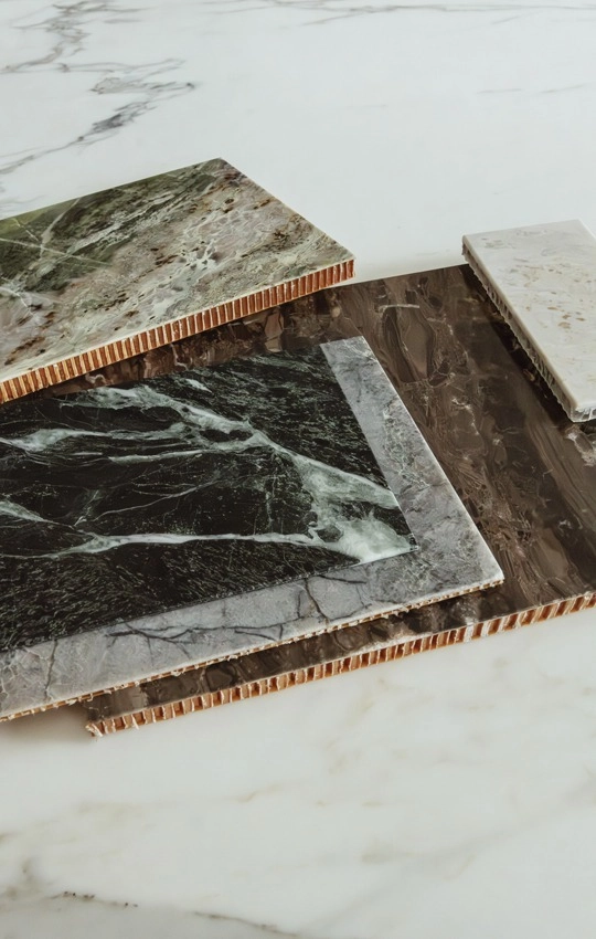 L’innovazione si fonde con la tradizione. Un sottile strato di marmo perfettamente unito ad un’anima a nido d’ape in alluminio, rivestita in fibra di vetro ed accoppiata con adesivo bicomponente. Qui la forza del marmo incontra la leggerezza, e l’eleganza sfida la gravità.